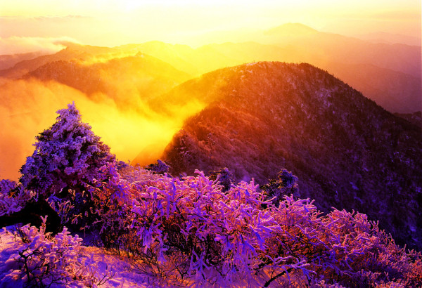 이사진은 천왕봉애서칠선게곡내려가는길목목을지나 바로아래큰바위에서본격적인노을직전에찍은것임니다 왼쪽에있는작은구상나무가이사진의전체바란스를잡아주는큰역할를하고있읍니다 혹시이담에이자리에서이런환경을만나찍을기회가생기면 이나무를빼고찍어서 비교해보시오 이부제하나가이사진을 돋보이게하고있음니다 눈으로봤을때있는듯마는듯한것인데 자리를옴겨서 제자리를잡아주었읍니다다 항상사진을찍을때마다 그사진안에는확실한주제가있어야하고 그주제를도아주는부제가있어야대비가이루어저서 멋진사진이됨니다 주제와부제의크기대비 위치선정 주제가너무작고 부제만크면 주객이전도되여이사진을보는사람들에게내의도가전달되지않습니다 부제가꼭있어야하는것은아니지만 그사진에서주제를뺀 나머지는모두부제일것임니다 꼭이것만이사진의정석은아니고부제가없는사진도얼마든지있을수있지만 부제의중요성을잊이마십시오 박환윤.